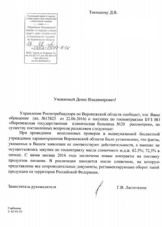Как мне стало известно БЮДЖЕТНОЕ УЧРЕЖДЕНИЕ ЗДРАВООХРАНЕНИЯ ВОРОНЕЖСКОЙ ОБЛАСТИ "ВОРОНЕЖСКАЯ ГОРОДСКАЯ КЛИНИЧЕСКАЯ БОЛЬНИЦА № 20 расположенная по вышеуказанному адресу, осуществляет закупки по госконтракту подозрительной молочной продукции: масло сливочное М.Д.Ж. 82,5% и 72,5% в пачках по цене ниже 250 рублей за 1 кг.