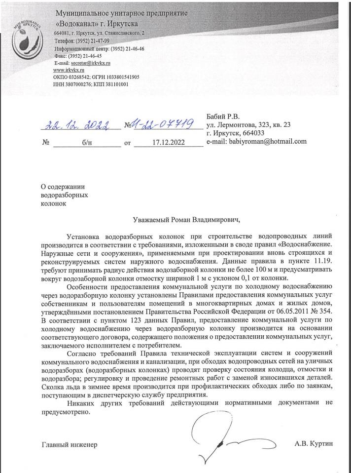 Роман БабийЗакрыто! От Администрации Иркутска пришел отрицательный ответ. Муп Водоканал не обязан обустраивать старые водозаборные колонки, расположение колонок вблизи заборов, на тротурах, вблизи домохозяйств граждан Администрацию устраивает. Канализацию делать никто не будет, вода будет продолжать стекать на тротуары, проезжую часть, под заборы жителям. зимой все будет стоять во льду. Чистить колонку МУП Водоканал будет, если вы сможете подать заявку (почти дословно).