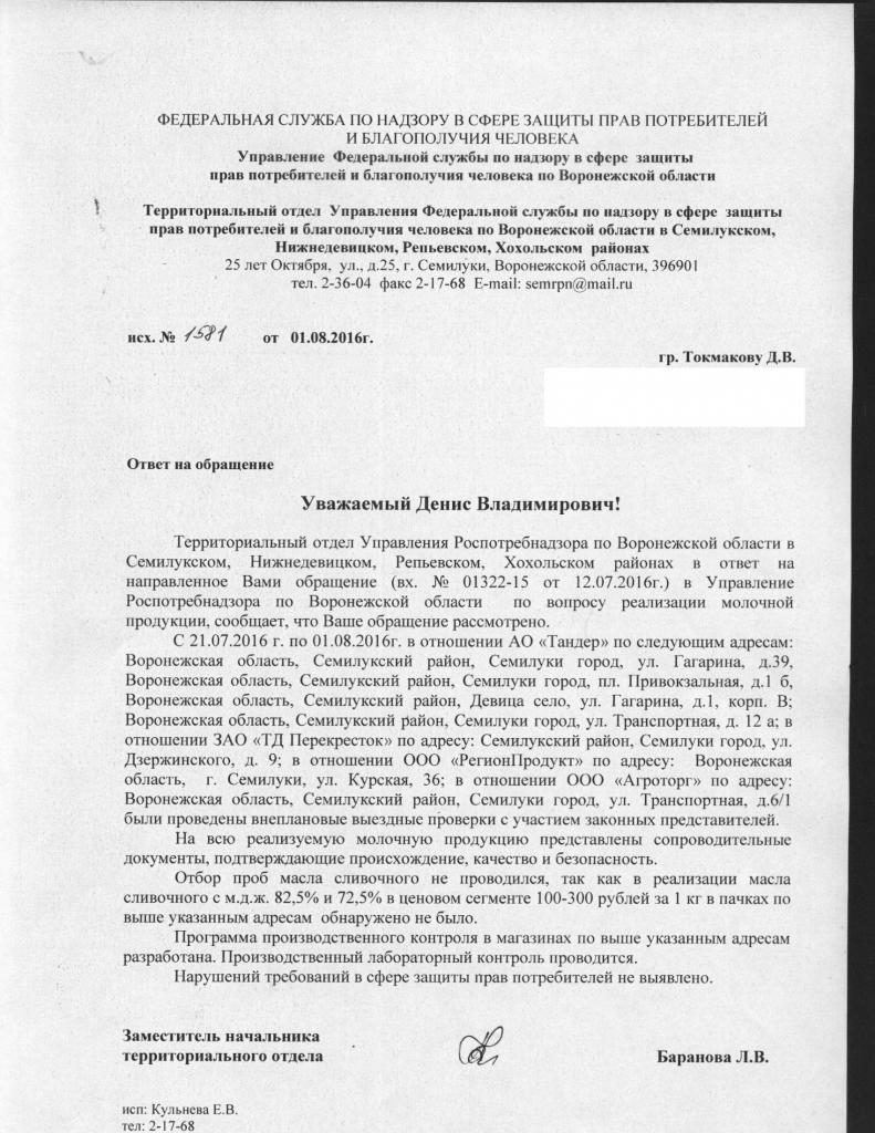 Отправлено 22.06.2016: "Управление Федеральной службы по надзору в сфере защиты прав потребителей и благополучия человека по Воронежской области"