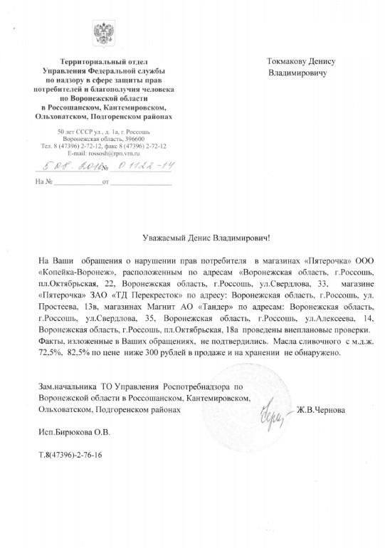 Отправлено 22.06.2016: "Управление Федеральной службы по надзору в сфере защиты прав потребителей и благополучия человека по Воронежской области"
