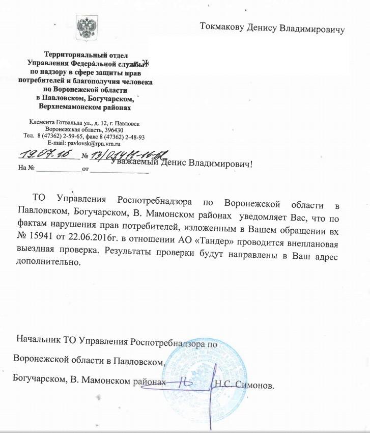 Отправлено 22.06.2016: "Управление Федеральной службы по надзору в сфере защиты прав потребителей и благополучия человека по Воронежской области"