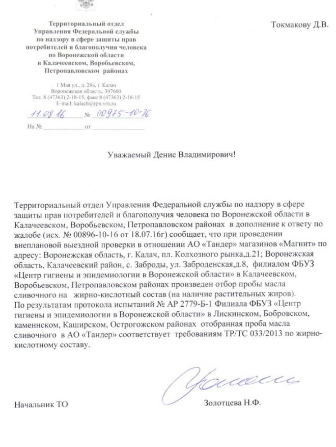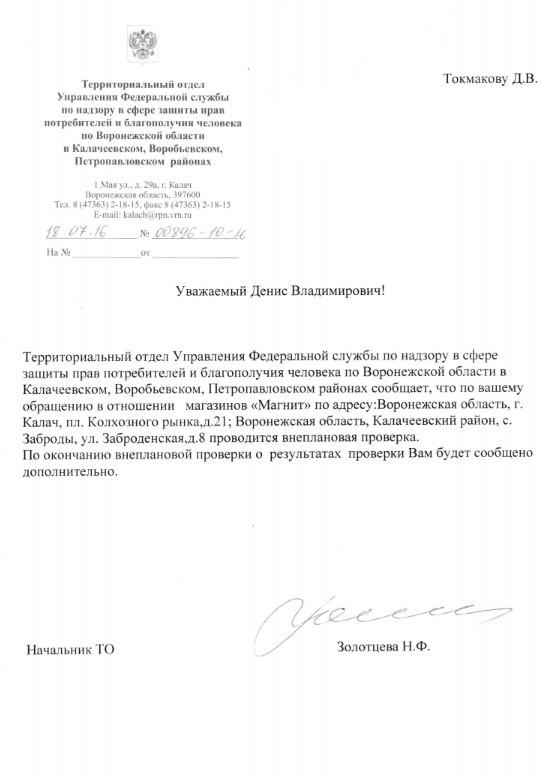 Отправлено 22.06.2016: "Управление Федеральной службы по надзору в сфере защиты прав потребителей и благополучия человека по Воронежской области"