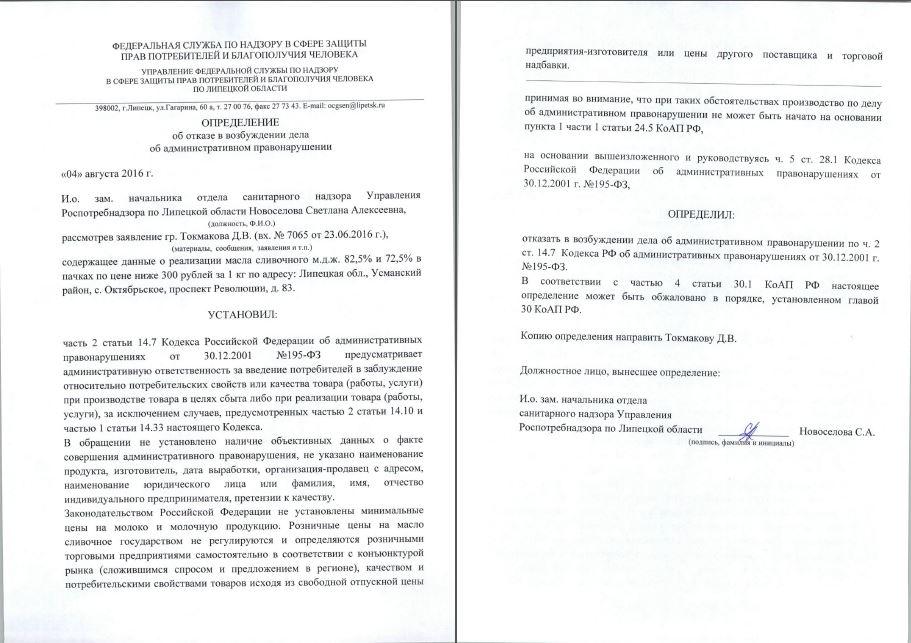 Прошу рассмотреть заявление в соответствии с КоАП РФ и, с учетом позиции Роспотребнадзора России (Письмо N01/11921-9-32 от 19.08.09), принять решения: