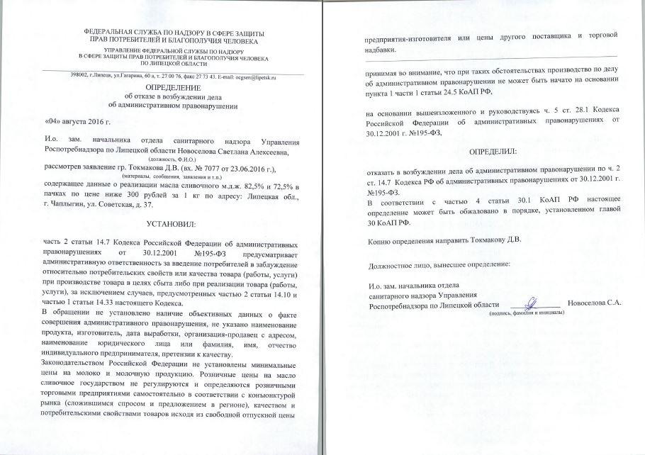 Прошу рассмотреть заявление в соответствии с КоАП РФ и, с учетом позиции Роспотребнадзора России (Письмо N01/11921-9-32 от 19.08.09), принять решения: