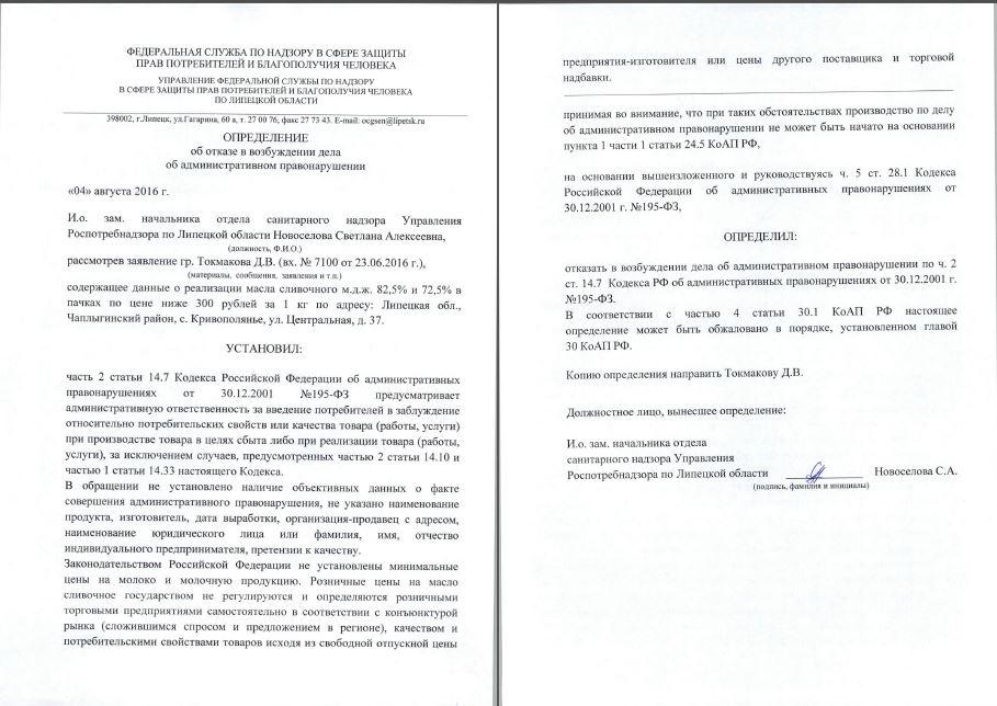 Прошу рассмотреть заявление в соответствии с КоАП РФ и, с учетом позиции Роспотребнадзора России (Письмо N01/11921-9-32 от 19.08.09), принять решения: