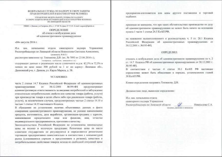 Прошу рассмотреть заявление в соответствии с КоАП РФ и, с учетом позиции Роспотребнадзора России (Письмо N01/11921-9-32 от 19.08.09), принять решения: