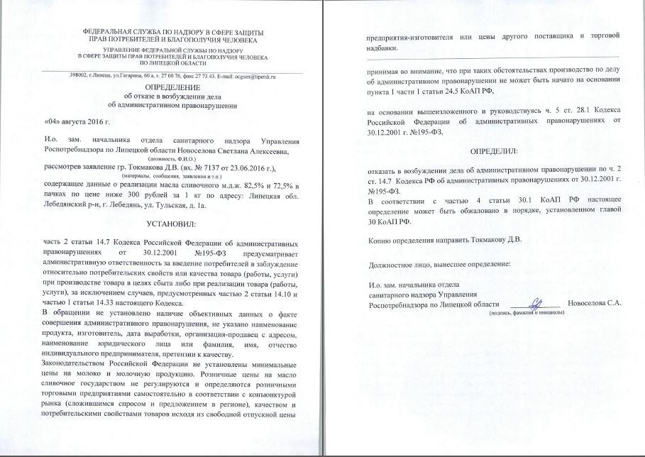 3. Об отборе (получении) образцов товара - масло сливочное М.Д.Ж. 82,5% и 72,5% в пачках по цене ниже 300 рублей за 1 кг.
