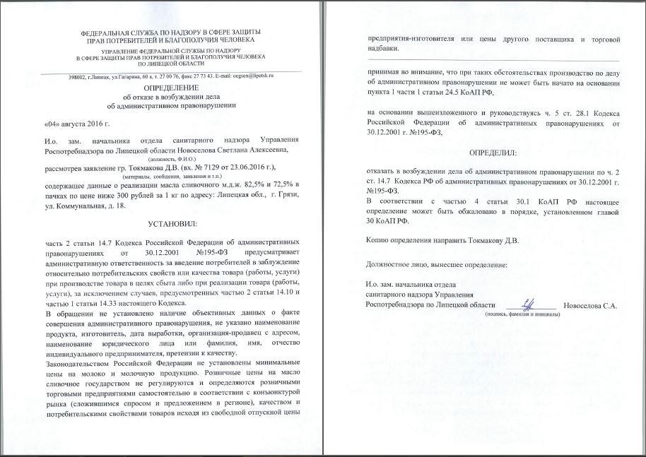 Прошу рассмотреть заявление в соответствии с КоАП РФ и, с учетом позиции Роспотребнадзора России (Письмо N01/11921-9-32 от 19.08.09), принять решения: