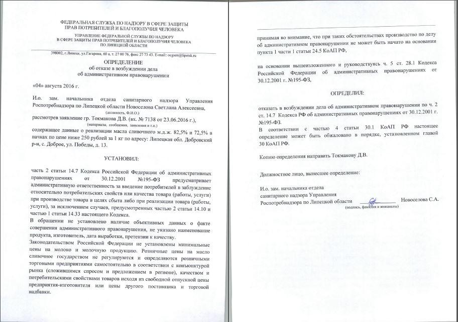 Прошу рассмотреть заявление в соответствии с КоАП РФ и, с учетом позиции Роспотребнадзора России (Письмо N01/11921-9-32 от 19.08.09), принять решения: