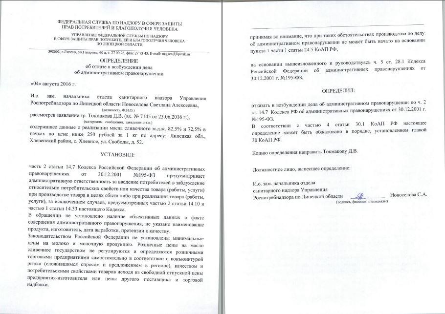 Прошу рассмотреть заявление в соответствии с КоАП РФ и, с учетом позиции Роспотребнадзора России (Письмо N01/11921-9-32 от 19.08.09), принять решения: