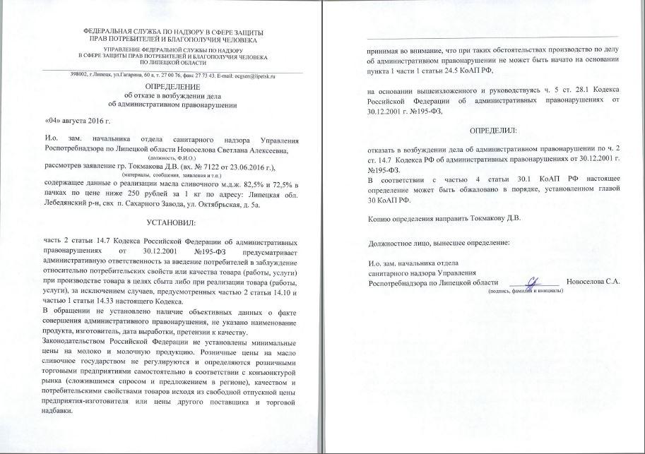 Прошу рассмотреть заявление в соответствии с КоАП РФ и, с учетом позиции Роспотребнадзора России (Письмо N01/11921-9-32 от 19.08.09), принять решения: