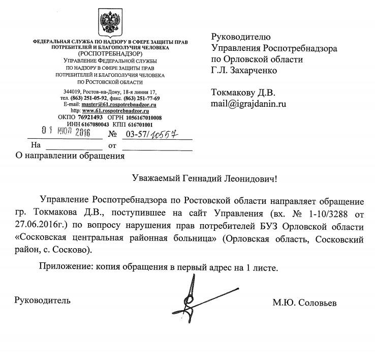 айГражданинОтправлено 24.06.2016: "Управление Федеральной службы по надзору в сфере защиты прав потребителей и благополучия человека по Орловской области "