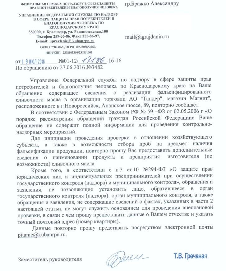 Отправлено 27.06.2016: "Управление Федеральной службы по надзору в сфере защиты прав потребителей и благополучия человека по Краснодарскому краю "