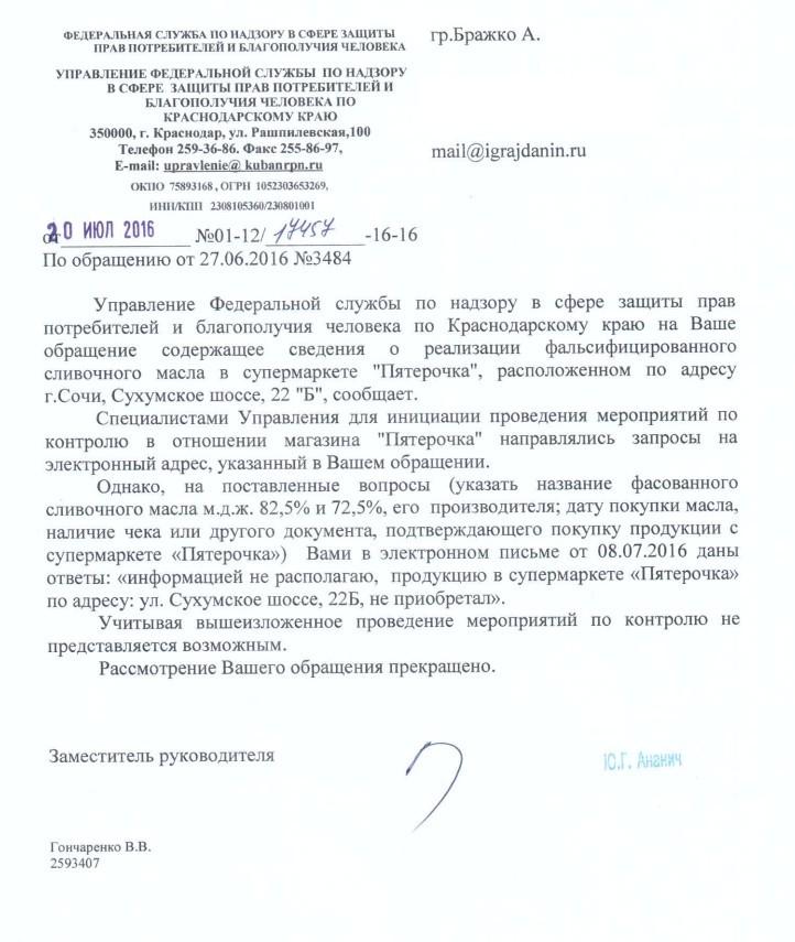айГражданинУважаемый Бражко Александр! В соответствии с Федеральным Законом РФ №59-ФЗ от 02.05.2006 «О порядке рассмотрения обращений граждан Российской Федерации» Ваше обращение от 27.06.2016, направленное в наш адрес с сопроводительным письмом заместителя руководителя Управления Роспотребнадзора по Краснодарскому краю от 30.06.2016 №01-12/15365-16-16, на реализацию фальсифицированного сливочного масла в супермаркете «Пятерочка», расположенном по адресу: г. Сочи, ул. Сухумское шоссе, 22Б, принято для рассмотрения территориальным отделом Управления Роспотребнадзора по Краснодарскому краю в городе-курорте Сочи.