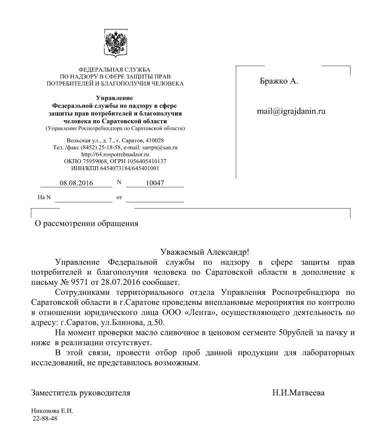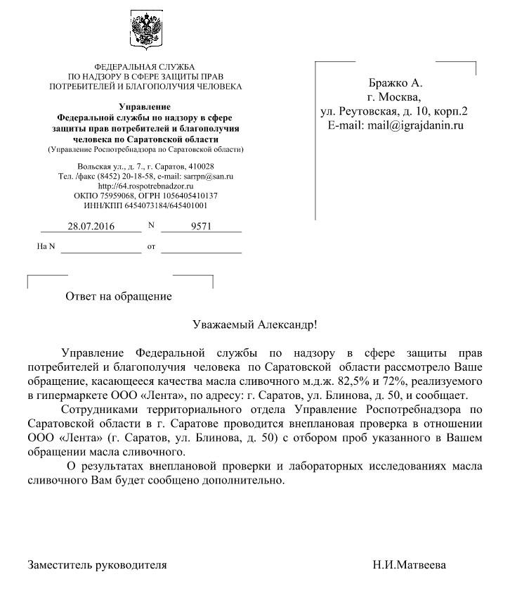 айГражданинОтправлено 27.06.2016: "Управление Федеральной службы по надзору в сфере защиты прав потребителей и благополучия человека по Саратовской области"