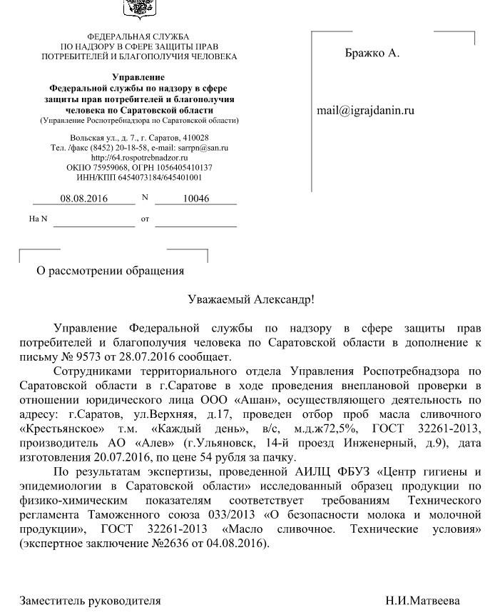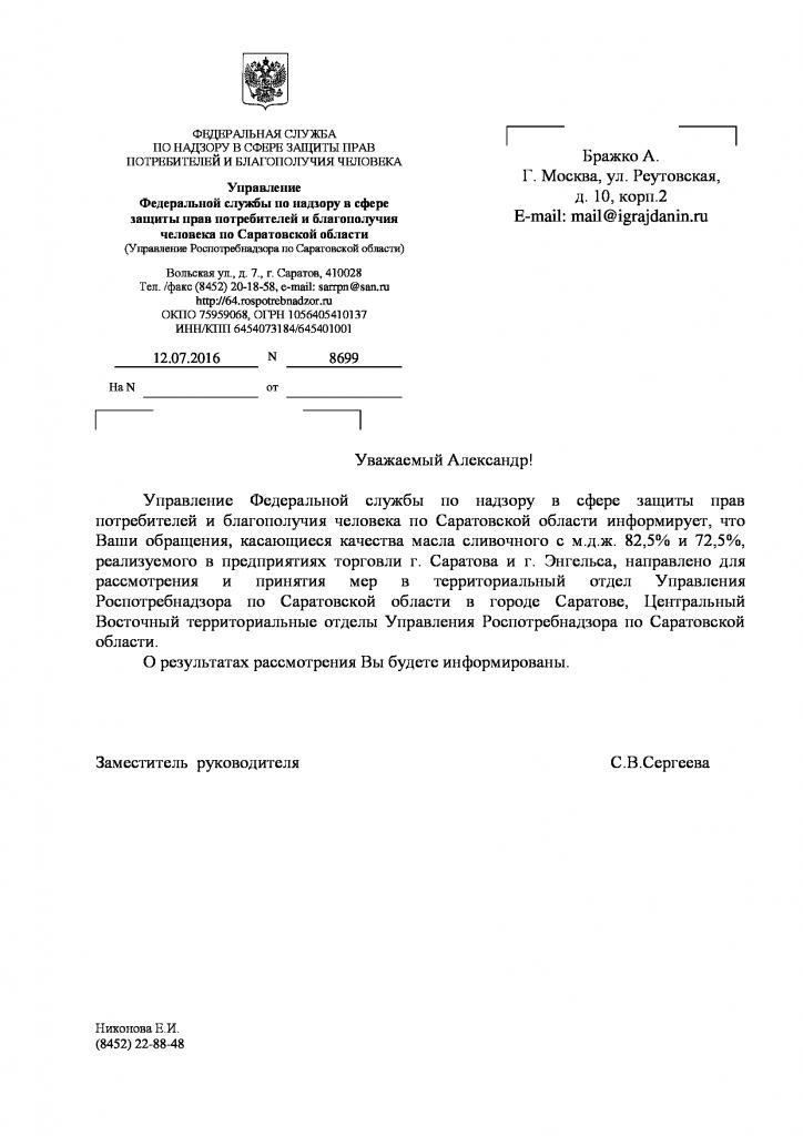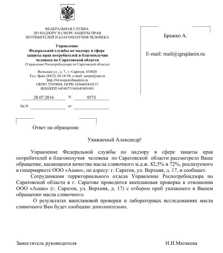 айГражданинОтправлено 27.06.2016: "Управление Федеральной службы по надзору в сфере защиты прав потребителей и благополучия человека по Саратовской области"
