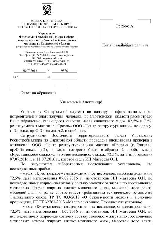 Отправлено 27.06.2016: "Управление Федеральной службы по надзору в сфере защиты прав потребителей и благополучия человека по Саратовской области"