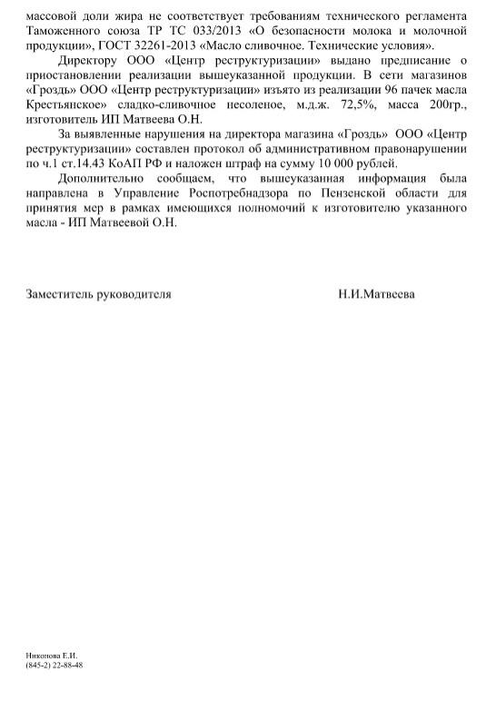 Как мне стало известно по вышеуказанному адресу осуществляется реализация подозрительной молочной продукции: масло сливочное М.Д.Ж. 82,5% и 72,5% в пачках по цене ниже 300 рублей за 1 кг.