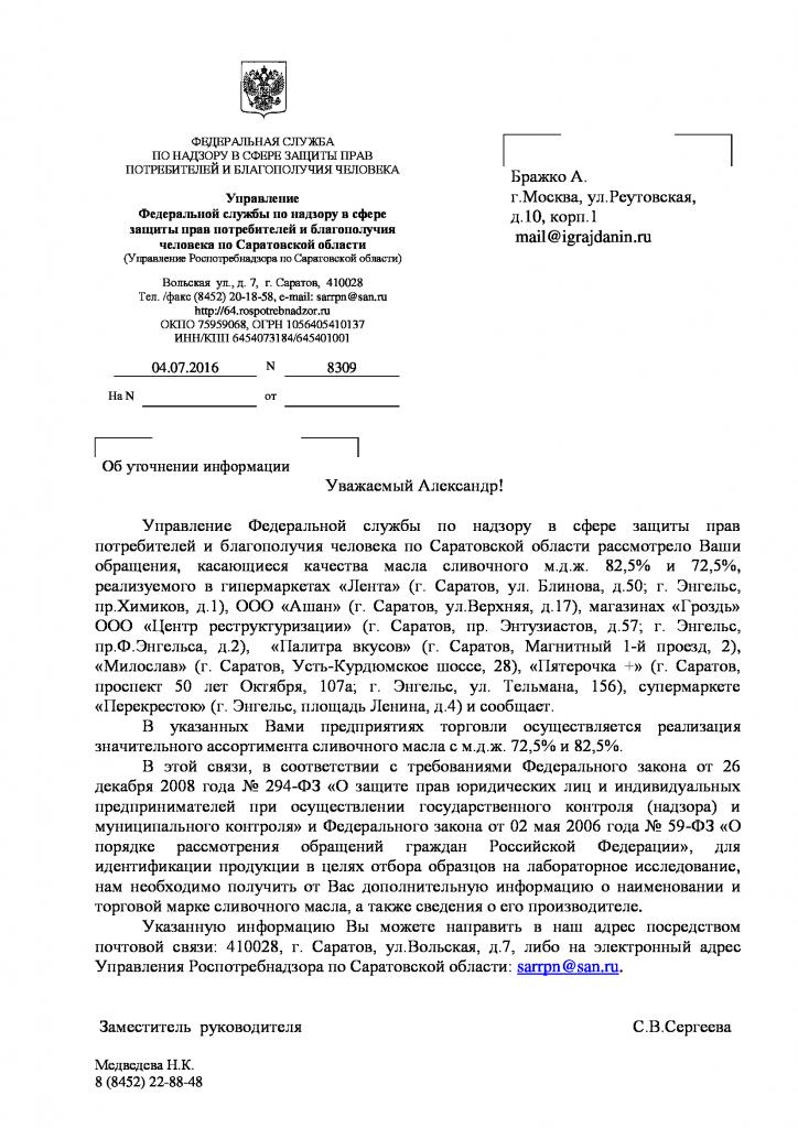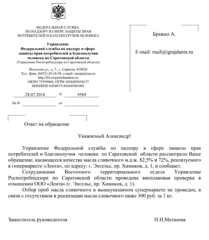 айГражданинОтправлено 27.06.2016: "Управление Федеральной службы по надзору в сфере защиты прав потребителей и благополучия человека по Саратовской области"