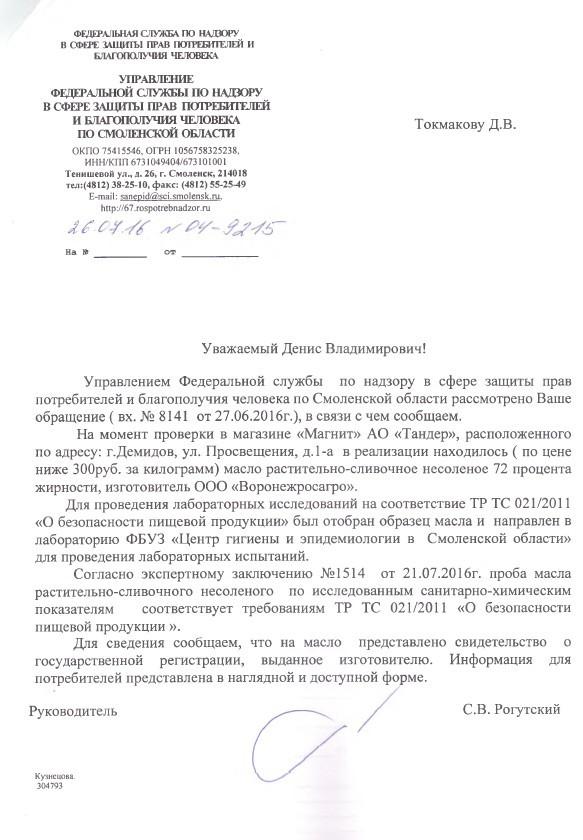 Отправлено 27.06.2016: "Управление Федеральной службы по надзору в сфере защиты прав потребителей и благополучия человека по Смоленской области "