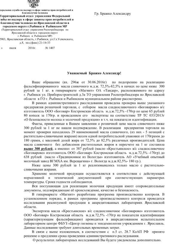 Александр БражкоПроблема закрыта. В магазине прекращена реализация "подозрительного" сливочного масла.