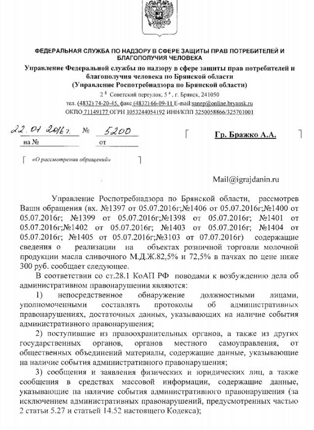 Отправлено 01.07.2016: "Управление Федеральной службы по надзору в сфере защиты прав потребителей и благополучия человека по Брянской области"