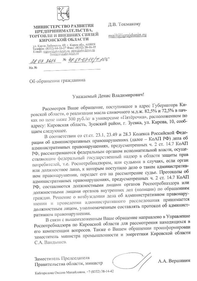 1.    Секретаря комиссии по противодействию незаконному обороту промышленной продукции в Кировской области- заместителя  министра промышленности и энергетики Кировской области Вандышева Сергея Анатольевича.  610019, г. Киров, ул. Карла Либкнехта, 69, тел. (8332) 38-15-65,  tek@ako.kirov.ru,.