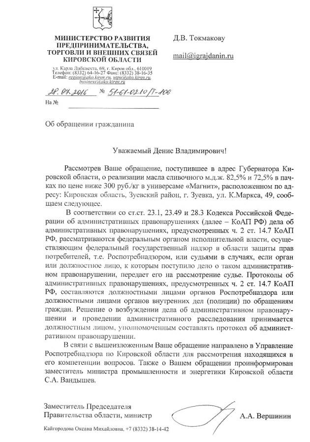 1.    Секретаря комиссии по противодействию незаконному обороту промышленной продукции в Кировской области- заместителя  министра промышленности и энергетики Кировской области Вандышева Сергея Анатольевича.  610019, г. Киров, ул. Карла Либкнехта, 69, тел. (8332) 38-15-65,  tek@ako.kirov.ru