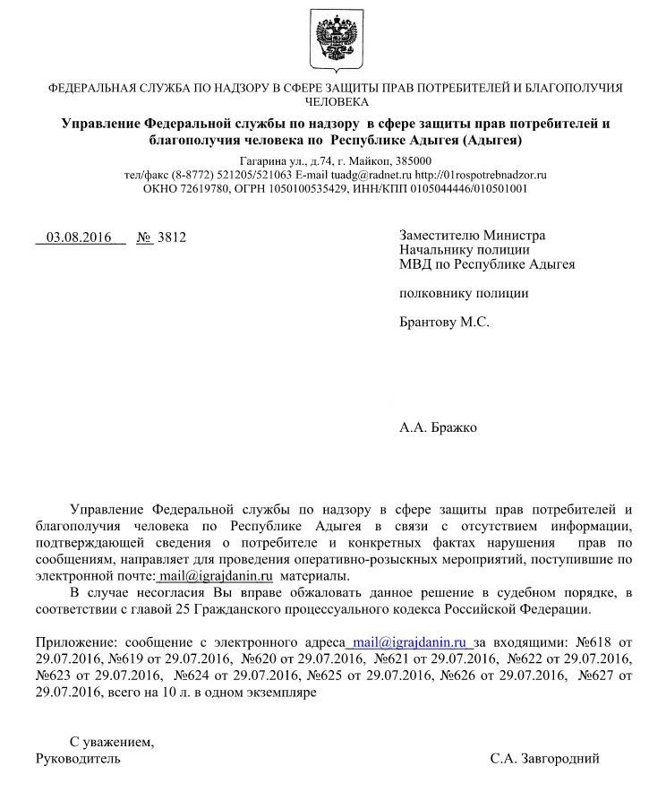 Отправлено 29.07.2016: "Управление Роспотребнадзора по Республике Адыгея"