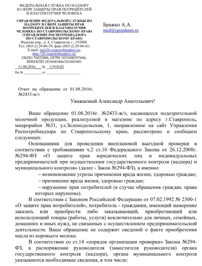 айГражданинОтправлено 29.07.2016: " Управление Роспотребнадзора по Ставропольскому краю"
