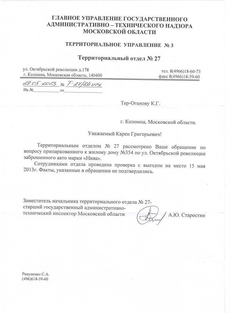 айГражданинОтправлено 13.05.2013: "Администрация городского округа Коломна", "Государственный административно-технический надзор МО, Территориальный отдел № 27 "