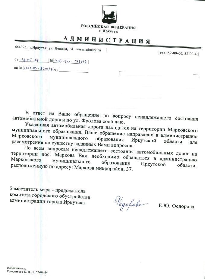 Евгения ЛапшинаА администрация г. Иркутска в соответствии с 59 ФЗ не ДОЛЖНА САМА перенаправить туда, в чьи полномочия входит данный вопрос!!!???? Обнаглели! Законов не знают!