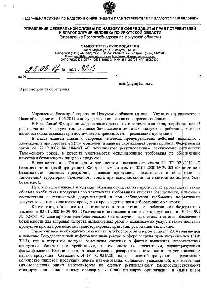 айГражданинОтправлено 11.05.2017: "Управление Роспотребнадзора по Иркутской области"